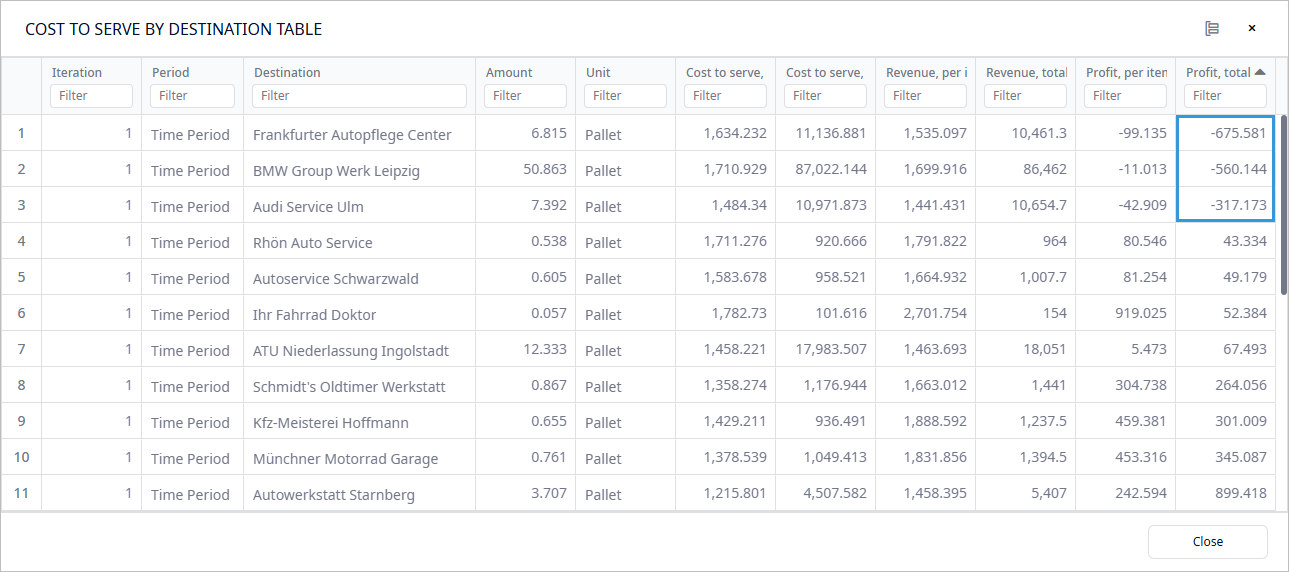 Let’s examine the Cost to Serve Light Table in the experiment's results dashboard. This table contains aggregated values of the key indicators collected as a result of the Cost to serve calculation. Each row in this table corresponds to a specific customer-product combination. If we sort the table data by the ascending Profit, total values, we will see that delivery of a significant number of products (most of which are BRE-DS-881 products) generates negative profit.