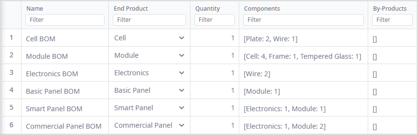 In the BOM table we will define the components and their quantities needed to produce the end products.