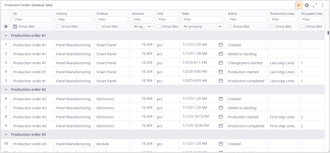 After running the simulation experiment, data on all production orders will be available in the Production Orders Table. Here you can find data on production time, setup times, the number of lines involved in production, etc., of each order.