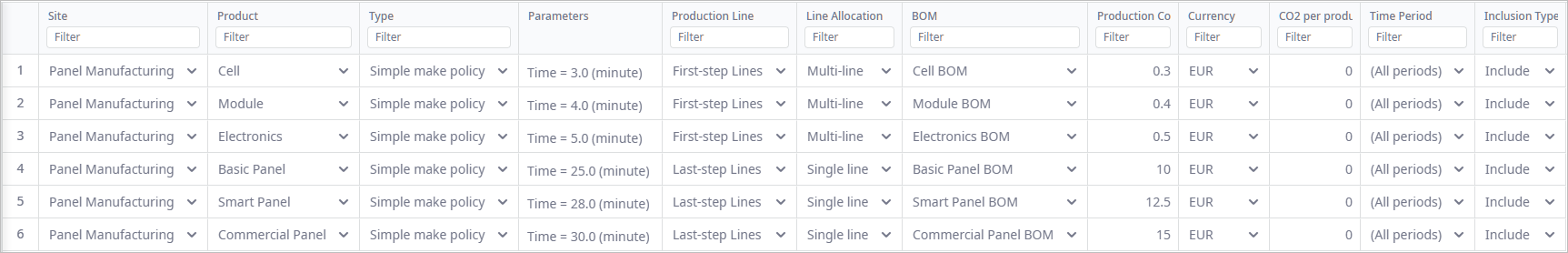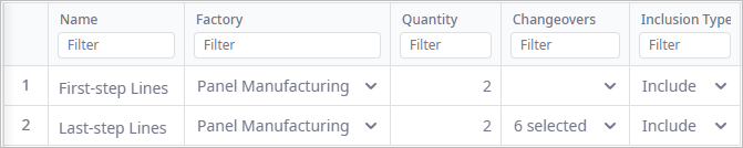 - Last-step Lines — these 2 lines will be producing three types of panels. The defined changeover times will be applied here for switching between product types to produce.