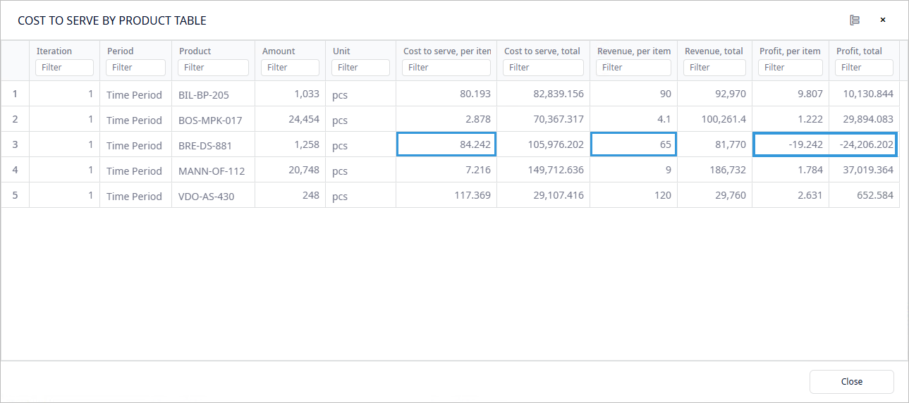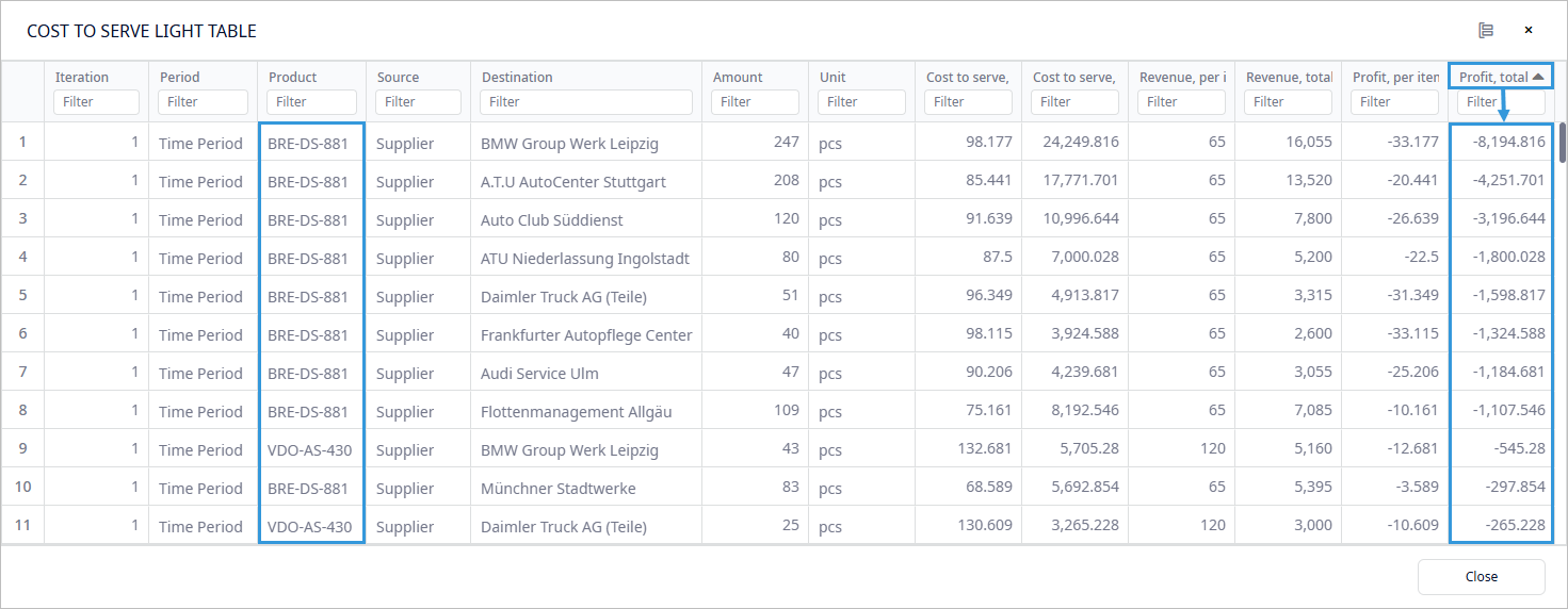 Let’s examine the Cost to Serve Light Table in the experiment's results dashboard. This table contains aggregated values of the key indicators collected as a result of the Cost to serve calculation. Each row in this table corresponds to a specific customer-product combination. If we sort the table data by the ascending Profit, total values, we will see that delivery of a significant number of products (most of which are BRE-DS-881 products) generates negative profit.