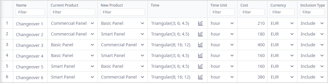 With this scenario we demonstrated the principles of the production system with limited resources and changeover costs. We also obtained a ready-to-use production schedule based on the initial demand data. This simulation example can serve as a foundation for further analysis of management strategies, and production line utilization, as well as assessment of the effect that various production parameters have on the company’s profitability.