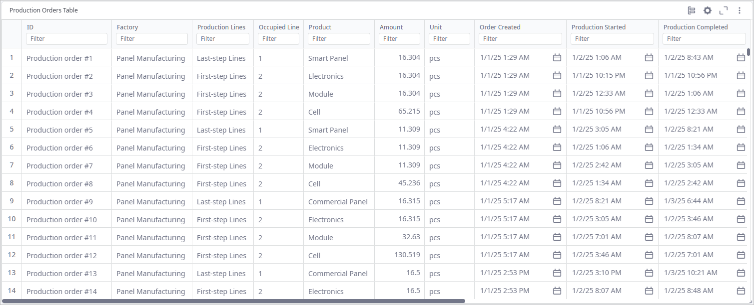 After running the simulation experiment, data on all production orders will be available in the Production Orders Table. Here you can find data on production time, setup times, the number of lines involved in production, etc., of each order.