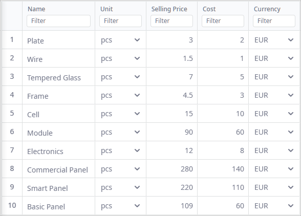 In the BOM table we will define the components and their quantities needed to produce the end products.