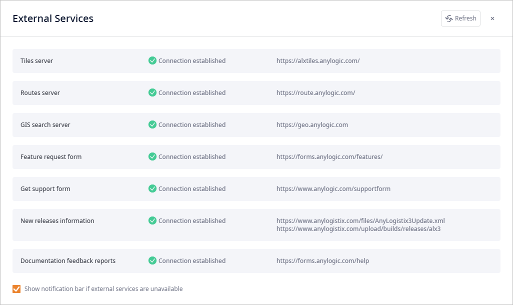 If a service is unavailable a notification bar will appear at the bottom of the anyLogistix window. If required, notifications can be disabled.